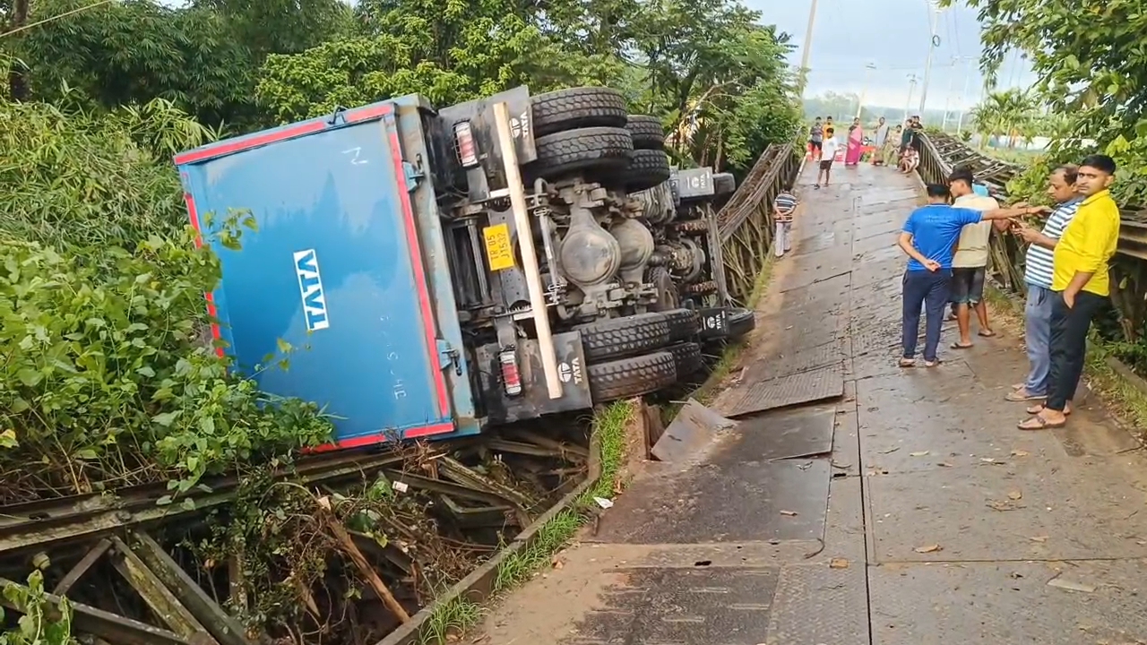 বিশ্বশ্বর মজুমদার, শান্তিরবাজার, ১৫ জুন || বাইখোড়া পূর্ত দপ্তরের খামখেয়ালীপনায় দুর্ঘটনার স্বীকার একটি মালবাহী ট্রাক, অল্পতে রক্ষা পেলো যান চালক। ঘটনার বিবরণে জানা যায়, শান্তিরবাজার মহকুমার বাইখোড়া প্রাথমিক স্বাস্থ্য কেন্দ্র সংলগ্ন এলাকায় বাইখোড়া লক্ষীছড়া যাতায়াতের রাস্তায় থাকা একটি বেইলি ব্রীজ দীর্ঘ অনেকবছর যাবৎ ভগ্ন দশায় রয়েছে। এই বিষয়ে স্থানীয় লোকজনেরা বাইখোড়া পূর্ত দপ্তরের আধীকারিকদের জানিয়েও কাজের কাজ কিছুই হয়নি। এতে করে রবিবার এই ব্রীজে টি আর ০৫ জে ১৫৩২ নম্বরের মালবাহী ট্রাক দুর্ঘটনার কবলে পরে। জানা যায়, ট্রাকটি ব্রীজে উঠার সঙ্গে সঙ্গে ব্রীজটি ভেঙ্গে পরে। এতে করে মালবাহী ট্রাকটি দুর্ঘটনার কবলে পরে।