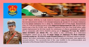 গত ১০ মার্চ ২০২৬ তারিখে খোয়াই জেলা অতিরিক্ত জেলা ও দায়রা আদালত মামলার রায়ে দুই অভিযুক্তকে দোষী সাব্যস্ত করে যাবজ্জীবন কারাদণ্ড এবং ১০ হাজার টাকা জরিমানা ঘোষণা করেন।