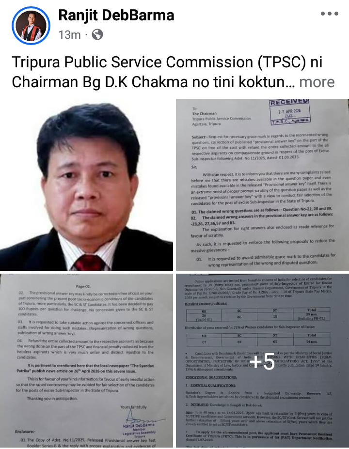 গোপাল সিং, খোয়াই, ২৭ এপ্রিল || ত্রিপুরা পাবলিক সার্ভিস কমিশন পরিচালিত এক্সাইজ সাব-ইন্সপেক্টর নিয়োগ পরীক্ষার প্রকাশিত ‘প্রোভিশনাল অ্যানসার কি’ এবং প্রশ্নপত্রে একাধিক ভুলের অভিযোগ তুলে সরব হলেন রামচন্দ্রঘাট বিধানসভা কেন্দ্রের বিধায়ক রঞ্জিত দেববর্মা। সোমবার (২৭শে এপ্রিল, ২০২৬) তিনি টিপিএসসি-র চেয়ারম্যানের কাছে একটি আনুষ্ঠানিক পত্র পাঠিয়ে পরীক্ষার্থীদের স্বার্থে অবিলম্বে প্রয়োজনীয় ব্যবস্থা গ্রহণের দাবি জানিয়েছেন।