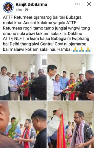 গোটা বিষয়টি সামাজিক মাধ্যমে তুলে ধরেন রামচন্দ্রঘাট বিধানসভা কেন্দ্রের বিধায়ক তথা মথা নেতা রঞ্জিত দেববর্মা। তিনি উল্লেখ করেন, তিপ্রাসা জনগোষ্ঠীর সার্বিক শান্তি ও সমৃদ্ধির লক্ষে বুবাগ্রা যেভাবে লড়াই চালিয়ে যাচ্ছেন, এই উদ্যোগ তারই এক অবিচ্ছেদ্য অংশ। চুক্তির প্রতিটি শর্ত যাতে অক্ষরে অক্ষরে বাস্তবায়িত হয় এবং প্রত্যাগত ভাইবোনেরা যাতে সঠিক মর্যাদা ও সুযোগ নিয়ে মূল স্রোতে ফিরতে পারেন, সে বিষয়ে দল সর্বদা সজাগ রয়েছে।